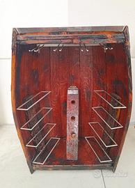 Semi-Barrique d’arredo, mezza botte per esposizione bottiglie, ideale per allestimento enoteche, storici aziendali e sale degustazioni ma anche per un ambiente casalingo. Composta internamente da 8 supporti per appoggio bottiglie orizzontalmente, da 3 fori per inserimento collo bottiglie, da 4 porta calici e dotata di illuminazione interna con interruttore.