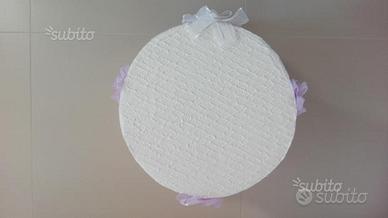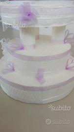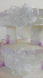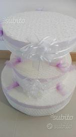 Base per apporto torta. La struttura è composta: i dischi tondi sono di polistirolo rivestiti di carta decorata di riso, di fiocchi lilla e di nastro bianco con ricamo ambedue i lati accentuato, lo stesso per i fiocchi bianchi, il tutto incollato con colla a caldo. La struttura è composta di 3 dischi e l'ultimo appoggia su 3 colonne per risaltare la portata. Ideale per ricorrenze, battesimo, compleanno, matrimonio per collocare una torta più piccola a forma di cuore con sopra i sposini, anniversario, ecc. Misure altezza cm 37 e larghezza base primo disco cm 42. Ultimo disco per appoggio torta cm 31. Euro 25