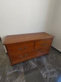 Base in ciliegio massello finitura antiquariato, 2 cassetti e cestone. L.124xP.39xH.65