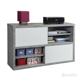 Mobile multiuso a due ante scorrevoli color cemento con frontali laccati bianchi lucidi.