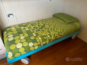 Base letto singolo con ruote con doghe in legno, usato ma in buono stato, angoli leggermente scoloiti. Colore: turchese