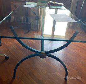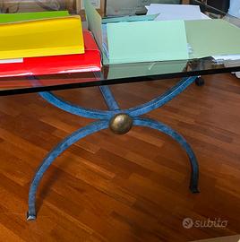 Base tavolo in ferro blu. Sostiene un piano in cristallo, sbeccato, quindi in omaggio, di 2 metri per 1 m. La base è adatta sia per interni che esterni