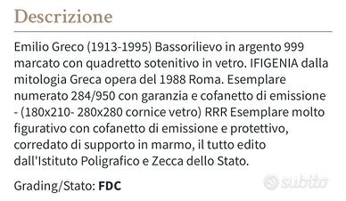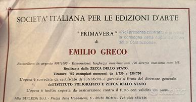 Bassorlievo “Primavera” in argento 999/1000, 750 esemplari realizzati, su espostitore in cristallo. Acquistato nel 1987 a tre milioni di lire. Certificato di autenticità ed originalità della Zecca di Stato.