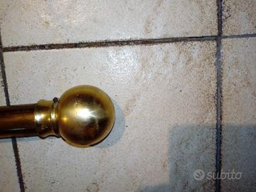 In ottimo stato, integro, no rotture, diametro 26mm, lunghezza 2,08 mt, terminali con sfere D. 5cm, 20 anelli in ottone per aggancio tenda con sede di scorrimento in teflon per una dolce e silenziosa movimentazione; Q. 2 supporti in ottone lucido con sporgenza 20cm, nuovi in confezione sigillata completi di tappi a pressione e viti di fissaggio alla parete. Il bastone ed i supporti possono essere tagliati per ricavare la misura desiderata. Non spedisco, solo consegna mano a mano