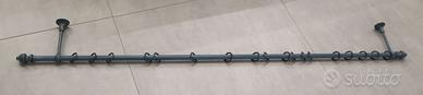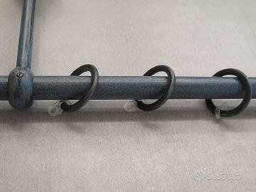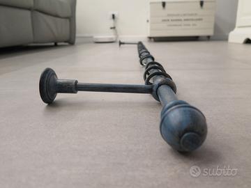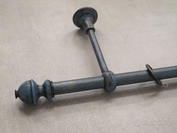 Bastone da tenda anticato blu-oro e nero in metallo pesante, completo di supporti per appenderlo al muro o al soffitto e di 18 anelle. Lunghezza cm. 168, lunghezza dei supporti cm. 18,5.