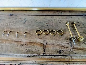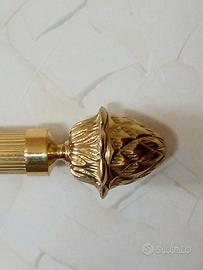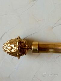 Bastone per tende in ottone, colore dorato, con finali a forma di pigna adatto per tendaggi ornamentali ed arazzi. È corredato da 42 anelli con gancio, 2 attacchi a muro e 2 embrasse ferma tende a forma di gancio. Lunghezza: 270cm Diametro anelli: 5,5cm Lunghezza attacchi a muro: 22cm Embrasse Larghezza: 3cm Embrasse Altezza: 4cm 50 euro VENDITA DIRETTA SU FIRENZE NO SPEDIZIONI