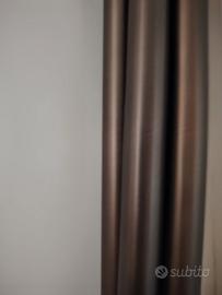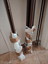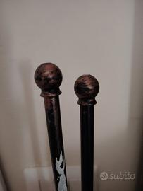 Cinque bastoni per tende per tre balconi o finestre, in metallo brunito, con 10 terminali, 6 braccetti e 2 bastoncini. Due coppie di bastoni vanno in coppia per doppie tende (discese laterali e velo centrale) e hanno i relativi braccetti. Un bastone invece è singolo e ha i braccetti normali. Inclusi i terminali, sono tutti lunghi 210 cm