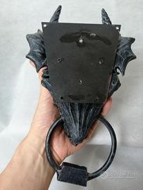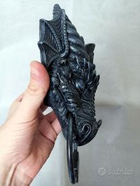 Bellissimo batacchio da fissare alla porta a forma di testa di drago. Si fissa con 4 viti o chiodi oppure con della colla o del biadesivo che abbiano una buona tenuta.