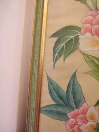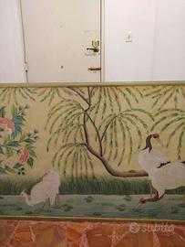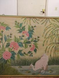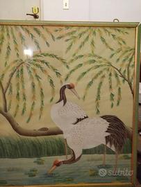 Batik su seta con paesaggio con aironi, dimensioni 171x85 cm, fatta a mano, bella cornice abinata con gusto e con vetrodi protezione