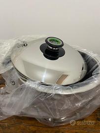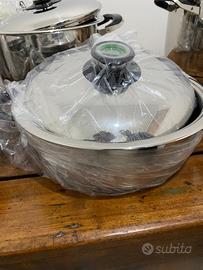 Batteria di pentole AMC (alfa metalcraft corporation) originale, in acciaio inossidabile. Nuova, imbustata ed inscatolata. Vendo per regalo doppio. Serie 28. No induzione. Composta da 11 pezzi, 5 pentole e relativi coperchi con manico a temperatura e bistecchiera. In aggiunta retina ed audiotherm.