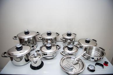 Sistema di cottura in acciaio inox 18/10 con fondo capsulato e cialda in lega per espansione di calore, cottura dietetica senza olio o grassi, antiaderente, indeformabile, cottura con grande risparmio energetico, adatta per Gas, elettrico, induzione.