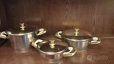Batteria di pentole Diamant Stainless Steel 18/10 in acciaio inox con manici e coperchi con dettagli dorati, composta da 7 pentole, 1 scolapasta, 1 teglia, 2 accessori per scolare, 6 coperchi. Dettaglio misure: 1 pentola Ø 20 cm. h. 8 cm., 1 pentola Ø 20 cm. h. 13 cm., 1 pentola Ø 24 cm. h. 10 cm., 1 pentola Ø 24 cm. h. 15 cm., 1 pentola Ø 28 cm. h. 14 cm., 1 pentola Ø 28 cm. h. 24 cm., 1 pentola Ø 28 cm. h. 8 cm., 1 scolapasta Ø 28 cm. h. 13 cm., 1 teglia Ø 27 cm. h. 7 cm., 2 accessori per scolare, 2 coperchi Ø 18 cm., 2 coperchi Ø 22 cm. e 2 coperchi Ø 26 cm.. No induzione.