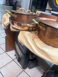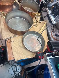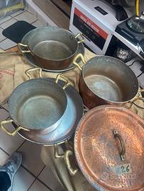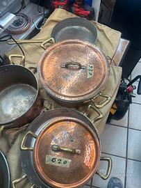 Pentole e coperchi in rame martellato e stagniato la batteria e composta da casseruola a due manici 27d e altezza 10 casseruola a due manici 24d /13 h casseruola 2 manici 20d /11h 2 pentole a 2 manici rispettivamente 24d/9h. E27d/6h ancora 2 padelle a1 manico lungo rispettivamente 24d/5h e32d /5h. Pui 3 coperchi delle seguenti misure 20 24 e26 le pentole sono usate e alcune necessitano di essere ristagnate e volendo lucidate cosa che consiglio se verranno usate sol per esposizione non presentano ammaccature ne graffi importanti la spedizione e a carico del acquirente o consegna a mano se possibile