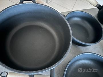 Batteria di pentole pochissimo usata … comprende 2 casseruole , un pentolino e 3 padelle di diversa grandezza