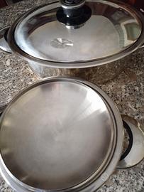 Vendo batteria di pentole e coperchi marca DMG serie 'Eternity',in acciaio inox 18/10,nuove (in confezioni originali) e usate.Alta qualità tedesca, garantite a vita.Lista misure pentole nuove: 1) cm.30 diametro -20 altezza 2) cm.28 diametro -20 altezza 3) cm .26 diametro -10 altezza 4) cm.24 diametro -18 altezza 5) cm.22 diametro -10 altezza 6) vaporiera -28 cm. diametro 7) cm.30 diametro - 10 altezza 8) pesciera vapore -30 cm.diametro 9) bistecchiera - cm.26 diametro -5 altezza + 3 mestoli e alcuni ricambi. Misure pentole usate (poche volte) : 1) pesciera classica- cm. 30 diametro -cm.10 altezza 2) cm.20 diametro -cm.8 altezza.Condizioni di vendita: 1) Consegna a mano ad Atripalda (provincia di Avellino) su appuntamento,con piccolo sconto sul prezzo. 2) Spedizione a mie spese dopo pagamento anticipato esclusivamente con bonifico.Astenersi se non interessati a comprare.