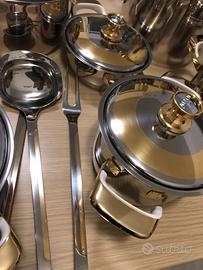 Set di pentole in acciaio inox con disegni in oro, Diamant,sono 7 pentole, 6 coperchi, 1 scolapasta, 1 coppa, una rete x vapore, set 3 mestoli con asta per appenderli, totale 20 pezzi