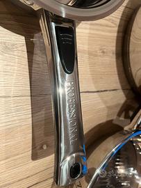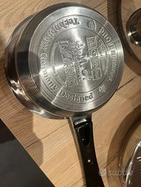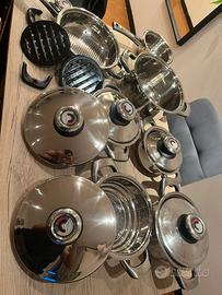 Batteria di pentole in acciaio Inox A.M.C PROFESSIONAL , GERMANY. I POMOLI DEI COPERCHI sono muniti di TERMOSTATO visibile in foto utile sempre al risparmio energetico, ma principalmente per conoscere effettivamente la temperatura all'interno della pentola, evitando di alzare ripetutamente il coperchio evitando la sbollitura e la perdita di aromi ma principalmente di vitamine. I nuovissimi manici hanno la nuova impugnatura capovolgendo i coperchi servono per appoggiare le pentole