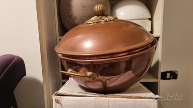 Batteria di pentole in rame con interno argentato e con decorazione in ottone rifinite a mano dall'artigiano Pasquale Franzetti