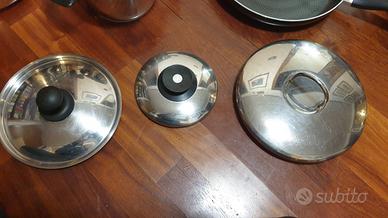 Batteria di 12 pentole (una di diametro 18 cm non appare in foto) tutte inox 18-10 tranne la padella, tutte in ottima qualità e di stato con fondo grosso in alluminio. Una di queste è AMC con coperchio e una è la pastaiola grande anch'essa con coperchio. c'è anche un terzo coperchio. La maggior parte sono della ottima GOTTINGHER. Le pentole non sono adatte per piani a induzione. la consegna a mano viene effettuata ovviamente senza aggiunta di spese di spedizione.