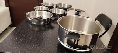 Batteria nuova doppio Fondo acciaio inox 18/10 ottima qualità.Sono 7 Pentole dalla più piccola alla grande, 5 coperchi, il coperchio si può usare come appoggio pentola. Molto bella.
