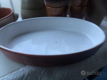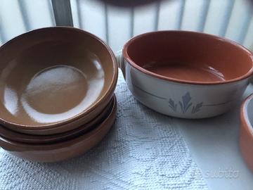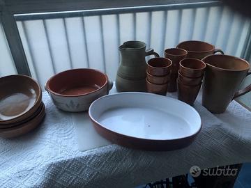 Come da foto Batteria in terracotta con tre scodelle per salse, dieci scodelle piccole (per esempio per zuppa ai frutti di mare), un coperchio, una insalatiera/fruttiera rotonda da portata con disegno azzurro chiaro, un piatto ovale da portata. Due caraffe e nove bicchieri tutti di tinta uguale e una caraffa in stile arte povera inglese. Notare che le padelline, la teglietta rettangolare, il tegamino verde sono tutti in piral quindi si possono mettere sulla fiamma. Il prezzo si intende per tutto il gruppo ed è trattabile ma ciascun articolo può essere comprato per pezzo singolo secondo offerta del compratore.