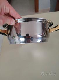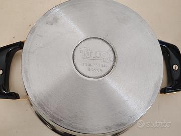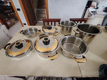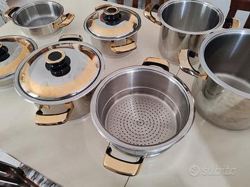 Vendo batteria di pentole in acciaio inox 18/10 marca Tutto S.p.A., composta da circa 10 pezzi tra pentole di varie dimensioni, coperchi e vaporiera. Le pentole sono in ottime condizioni, usate pochissimo, sempre conservate con cura. Fondo spesso per una buona distribuzione del calore. Manici color oro stile vintage, molto eleganti. Ideali per uso quotidiano Vendo per inutilizzo 80€ Ritiro a mano