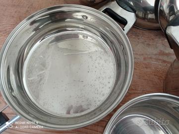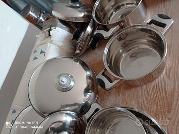 Vendo batteria completa di pentole in acciaio inox 18/10 composta da 6 pezzi con relativi coperchi. Alcune pentole presentano dei piccoli puntini e un coperchio ha il pomello rotto. Vista e piaciuta no perditempo. Prezzo poco trattabile