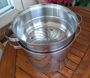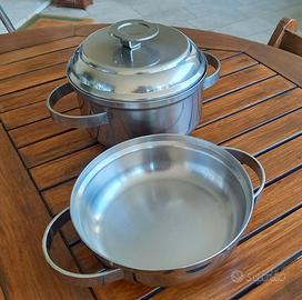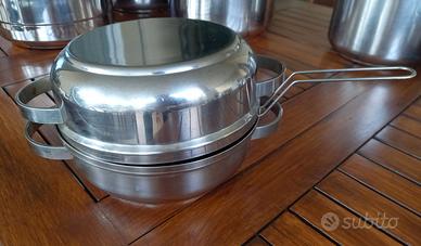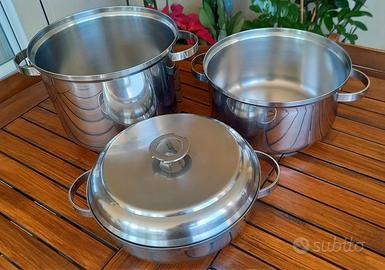 Vendo per passaggio a induzione una batteria di pentole Barazzoni in acciaio inox, completa di accessori per la cottura a vapore e a bagnomaria per un totale di 19 pezzi. Il set è composto da: 1 pentola, 1 casseruola, 1 tegame e 1 coperchio diametro 24 cm 1 pentola, 1 casseruola, 1 tegame e 2 coperchi diametro 20 cm 1 casseruola, 1 tegame e 1 coperchio diametro 16 cm 1 colapasta, 2 coperchi alti per cottura a vapore, 2 piatti forati per cottura a vapoe e relativa pinza, 1 pentola per cottura a bagnomaria Tutto in ottimo stato.
