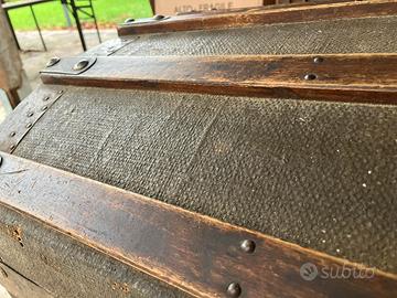 Vendo stupendo baule del ‘900 con stecche in legno, borchie e rivestito in tessuto di canapa 50x52x90