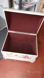Bellissimo baule raffigurante immagini di "Alice nel paese delle meraviglie ". Adatta per la cameretta dei bambini dove riporre giochi, o per qualsiasi altro uso. foderato in tessuto. Da ritoccare eventualmente l angolo in basso a destra.