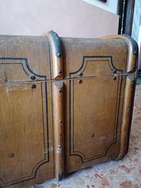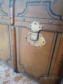 Baule da viaggio della fine 800 inizi 900. Realizzato in legno rivestito in tela. Chiusura ed elementi in ottone, non sono presenti chiavi per la chiusura. Maniglie e bordature in cuoio. All'interno fibbie per tenere fermi i vestiti e scomparto che si apre a fisarmonica in legno e tessuto. Presenti su entrambi i lati delle piccole placche in ottone indicanti la casa produttrice: G. Winternitsz Valigeria Universale Genova. Presenta segni del tempo, risulta tuttavia perfettamente conservato senza danni o parti mancanti. La superficie esterna in tela presenta un colore marrone in alcune zone più scuro, effetto dovuto al passare del tempo. Tale colorazione potrà diventare uniforme se sottoposto ad un eventuale trattamento per ripristinare il colore originale in ogni parte del baule. Oggetto d'epoca per collezionisti e amanti dei tempi passati. Nonostante il tempo l'oggetto è ben conservato.