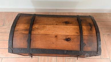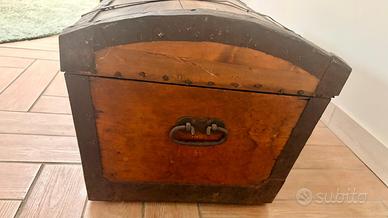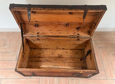 Baule in legno in buono stato con iserti in ferro. Maniglie, chiusure a leva e lucchetto originali. Misure L 80, P 43, H 37