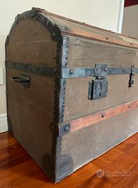 Baule antico, Italia, fine ‘800 primi 900 In tela color militare, inserti chiodati in legno e ferro. Coperchio stondato, maniglie laterali e cerniere in metallo Restaurato, interno ricoperto di carta Varese color verde/panna