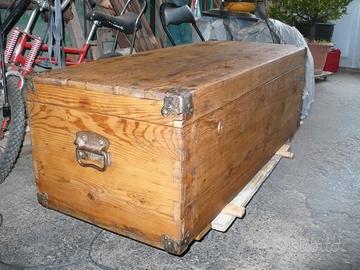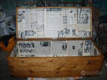 Vendo bellissimo vecchio baule anni 50, finemente restaurato in tutte le sue parti e con tutte le parti in metallo originali, misure L120, A40, P50.,senza tarli, copreso di chiave originale, rivestito internamente con giornali dello stesso periodo. Ottimo per collezionisti, per arredo interno o per vetrine di negozio. Disponibile spedizione, ma preferibile il ritiro a mano, in quanto la spedizione non è molto conveniente.