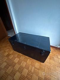 Vendo baule di colore nero, realizzato principalmente in legno con profili in metallo.