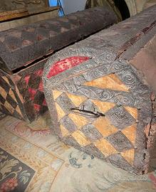 Serrature originali e stoffe damascate ancora originali, anche se molto consumate. Struttura in legno rivestite in lamiera di ferro battuto ritagliata, alternata a stoffa gialla e rossa. Sono due casse molto molto belle. L’epoca potrebbe essere tra il ‘500 e il ‘600.