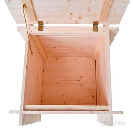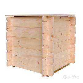 Baule cassapanca da esterno in legno di abete non trattato, spessore 16 mm e armatura di rinforzo adatta per essere utilizzata come seduta. Ottima per riporre cuscini, coperte, giocattoli e altri oggetti. Ideale anche per mettere al suo interno 1 bidoncino per la raccolta differenziata.