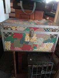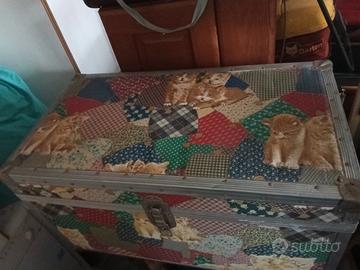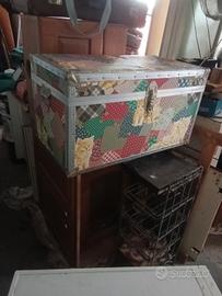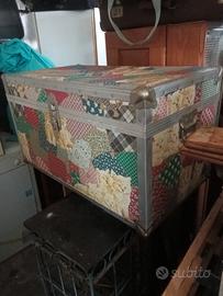 Baule decorato, con coperchio tipo cuscino. Bordi in metallo. Misure in foto. A Cremona.