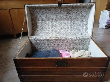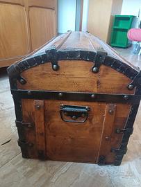 Vendesi baule capiente, restaurato, sia esternamente che internamente. L'aspetto è proprio quello del baule del pirata, in legno con profili in ferro. Dimensioni: lunghezza 80 cm x profondità 40 cm, h 47 cm