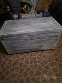 Questo oggetto è una cassapanca in legno massello, spesso proposta in stili rustici o shabby chic con finiture decapate per l'arredamento di interni.“1 metro di larghezza per 50 di profondità.”