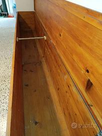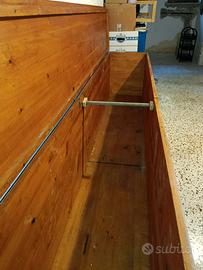 Grande baule rustico in spesse tavole di pino, con coperchio incernierato, smontato in 3 pezzi per facilitarne il trasporto. Dimensioni esterne (montato): cm 356 x 53 x h64; capacità 1.000 litri ca, peso oltre 90 kg. Spessore tavole cm 2,5.