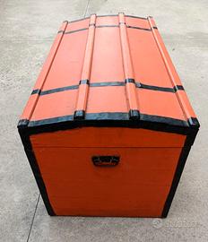 Cassa da viaggio vintage in legno e ferro, verniciata di colore arancio con dettagli neri a pianta rettangolare