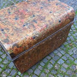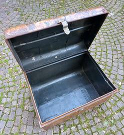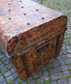 Baule in ferro decorato con decoupage, da sistemare leggermente all'esterno, misure 52cmx70cm, altezza 48cm