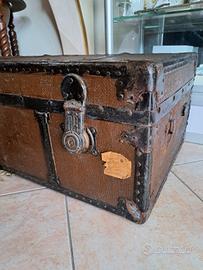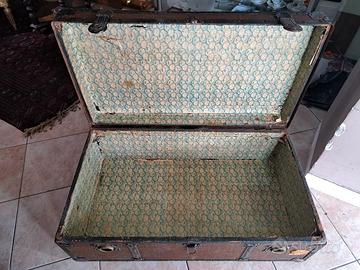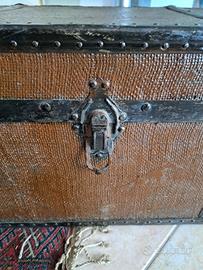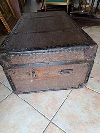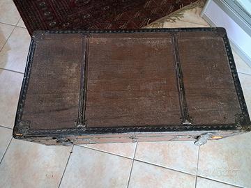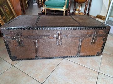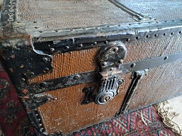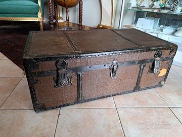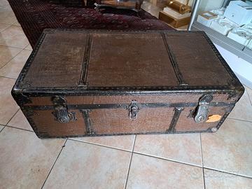 baule primi 900 in legno rivestito in juta bordatura cerniere e ganci in ferro misura 92x50 altezza 34 utilizzabile anche come tavolinetto da salotto....M&P Antichità siamo un negozio specializzato in antiquariato vintage e shabby vendita al dettaglio e all ingrosso scarichi settimanali oltre 500 articoli in negozio, abbiamo una vasta scelta di como comodini tolette armadi letti vetrine vetrinette credenze servanti angoliere librerie tavoli tavolinetti sedie poltrone poltroncine divani lampade lampadari tappeti scrivanie scrittoi secretere ribaltine consolle quadri cornici specchi cassapanche bauli oggettistica varia idee regalo e molto altro ci troviamo a Roma zona Castelverde via Massa San giuliano 26b POSSIBILITÀ DI CONSEGNA E SPEDIZIONE IN TUTTA ITALIA