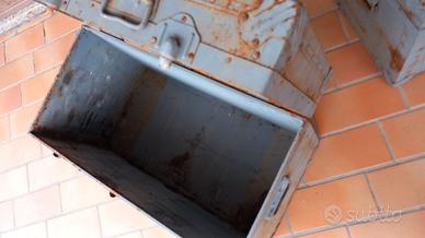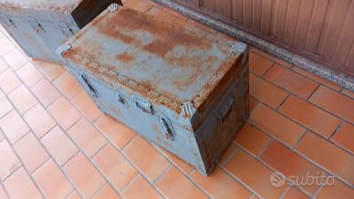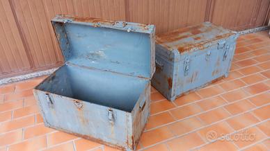 Baule in lamiera e compensato, con bordature di rinforzo in lamiera, solido, aspetto vissuto - misure 70 * 36, altezza 46 cm - cerniere, movimento di apertura e chiusura, maniglie e ganci di chiusura in perfetto stato - ottimo per collezione o creare ambiente con arredo caratteristico - disponibili 2 pezzi, il prezzo indicato è unitario - come da foto - [qw 9926] -