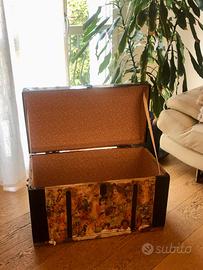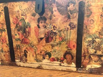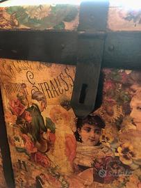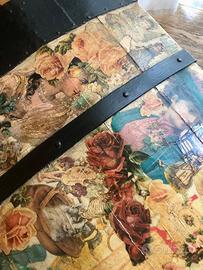 Baule in legno decorato con cura utilizzando la tecnica del decoupage e impreziosito da inserti in metallo mentre l'interno è rivestito con carta. In evidenza nell’ultima foto la parte bassa del baule che mostra segni di usura, tuttavia questo non compromette l’estetica del pezzo. Misure: L 70 cm H 44 cm P 38 cm Pezzo unico, ideale per essere utilizzato come: - Complemento d'arredo per salotto o camera da letto - Contenitore per oggetti