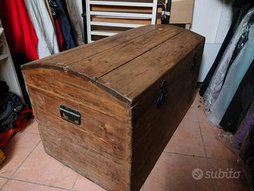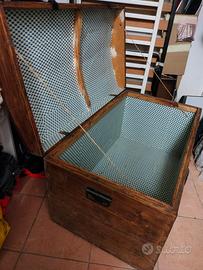 Baule in legno molto capiente ricoperto internamente il resto tutto originale ha un po di anni non so esattamente quanti ma in ottime condizioni e per chi ha taverna o camino e molto capiente e bello da vedere … misure L100P58xH60 no spedizione !
