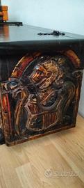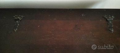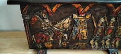 Bellissimo baule in rovere intarsiato e policromo. presenta elementi e ferramenta in ferro battuto. La parte superiore del baule presenta piccoli graffi dovuti al suo utilizzo. misure 85*37*46h Il coperchio e le pareti del baule sono spesso 3 cm