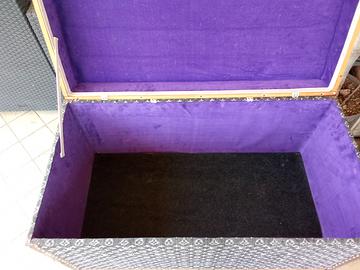 Affascinante ed imperdibile baule d'epoca completamente restaurato rivestito con tessuto firmato in jersey anni '90 interno in velluto. Pezzo unico utilizzabile anche come panca