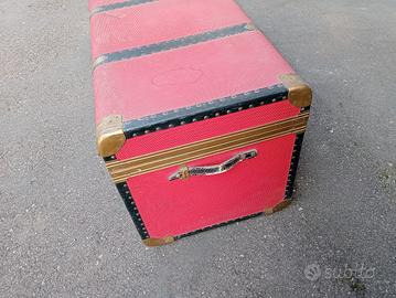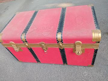 baule rosso cm. 100 x 60 x 55 con interno e supporto superiore in legno. rivestimento interno di carta danneggiato e qualche macchia in superficie.
